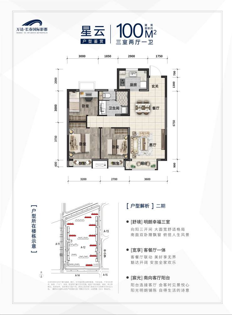 万达长春国际影都项目是万达集团坚持“高起点、高规格、高质量”的精工之作。打造智慧社区、运动社区、生态社区三大尊享主题、十大精通体系,树立长春工程质量标杆。打造智慧社区、运动社区、生态社区:无感同行入口大堂、林荫步道、户外会客厅、穿越隧道、儿童活动区、健身活动区、单元入户 、夜光跑道。