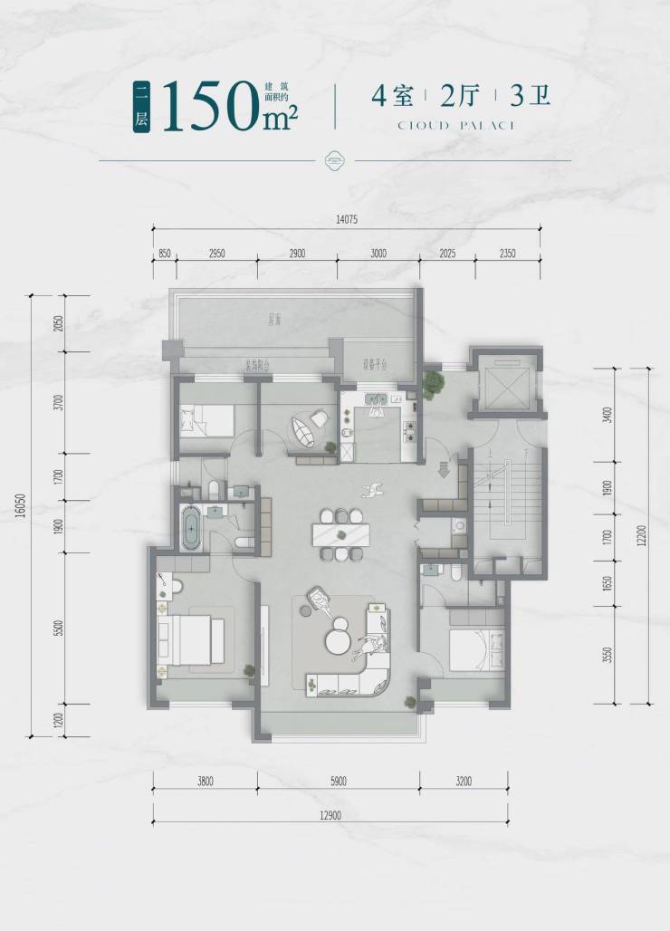 产品展示: 建筑面积约150㎡四室三卫两厅双套房全能格局,得房率超100%。