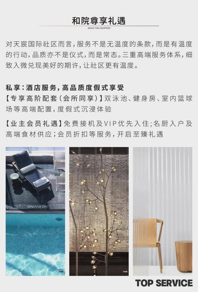 物业服务:天宸酒店提供 24 小时管家服务,为业主带来度假酒店会员级服务体验。