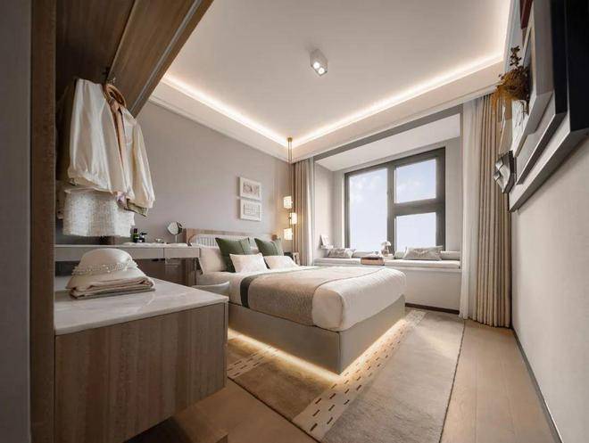 主卧套房设计,隐私性较好,飘窗设计更有效延申室内空间,也可以作为休闲区域使用,收纳空间设计的也比较充足,切实考虑年轻人买买买的购物习惯。