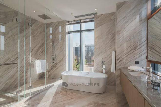 别墅外立面采用LOW-E玻璃幕墙与意大利黄洞石的精致干挂工艺,不仅彰显出建筑的现代美感,更融入了环保节能的设计理念。