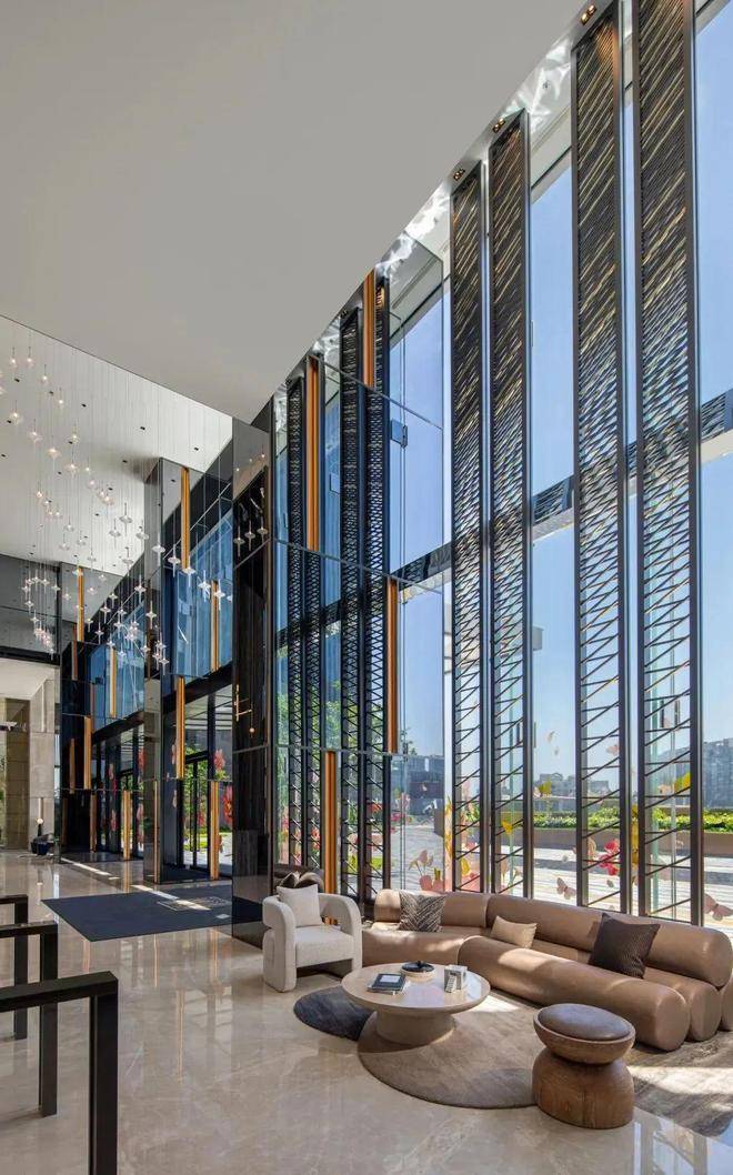 约9米超高挑空大堂:会客休息区分立礼宾台两侧,艺术作品萦绕四周,使每个置身于此的人都能拥有酒店级的尊贵感受;公区集合多位艺术家为TODTOWN天荟|悦麟度身创作的多维艺术品,包括环境音乐、环境香氛、雕塑、油画等,前卫的设计感和高品质的呈现力,营造出多重感官享受的艺术享受。