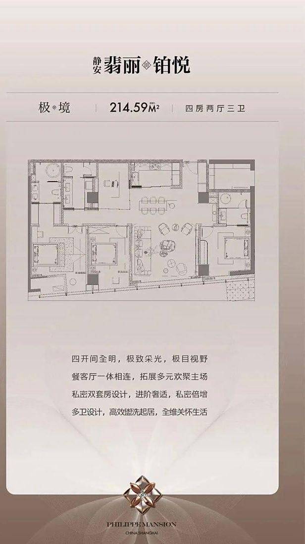 极境户型:约214㎡|4房2厅3卫(四开间+双套房)。