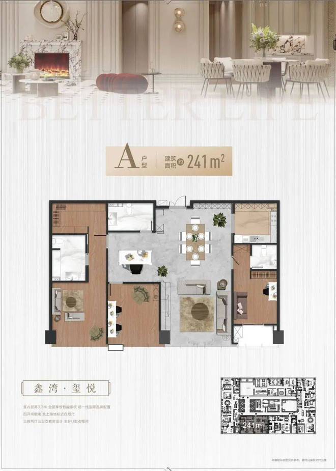 在户型设计上,推出了241平的玺悦、雅致和486平的世家、世族四种户型,对应不用空间喜好和需求的用户。