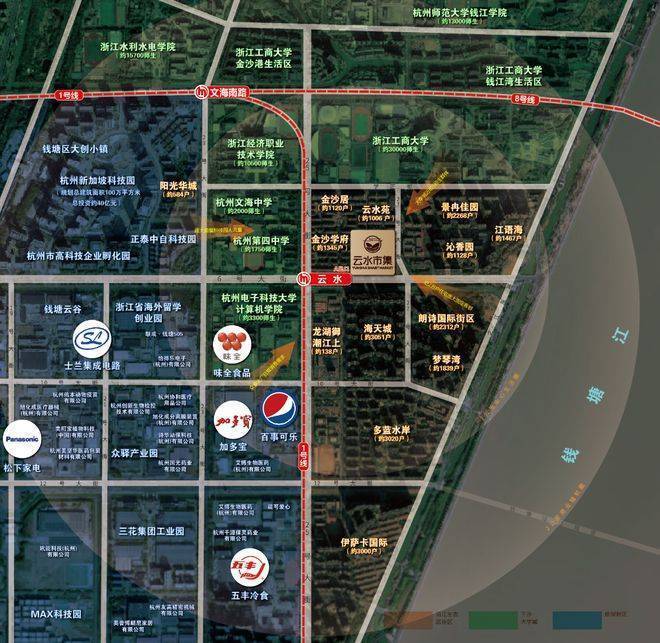 项目地处临近地铁1号线云水站A出口,属于下沙核心发展片区。项目3km内集聚高端产业资源,汇聚如百世可乐、西门子、东芝等众多世界500强企业及加多宝、味全等大型知名企业。项目500米范围内聚集了近20000户住宅居民,同时,项目北邻大学城,海纳14所高等院校;东面衔接沿江高端生态居住区,一公里范围内,坐拥超10个成熟千户住宅大盘。25万师生资源与超23万固定居住人口形成双向赋能,造就了我们项目无可比拟的商业价值。