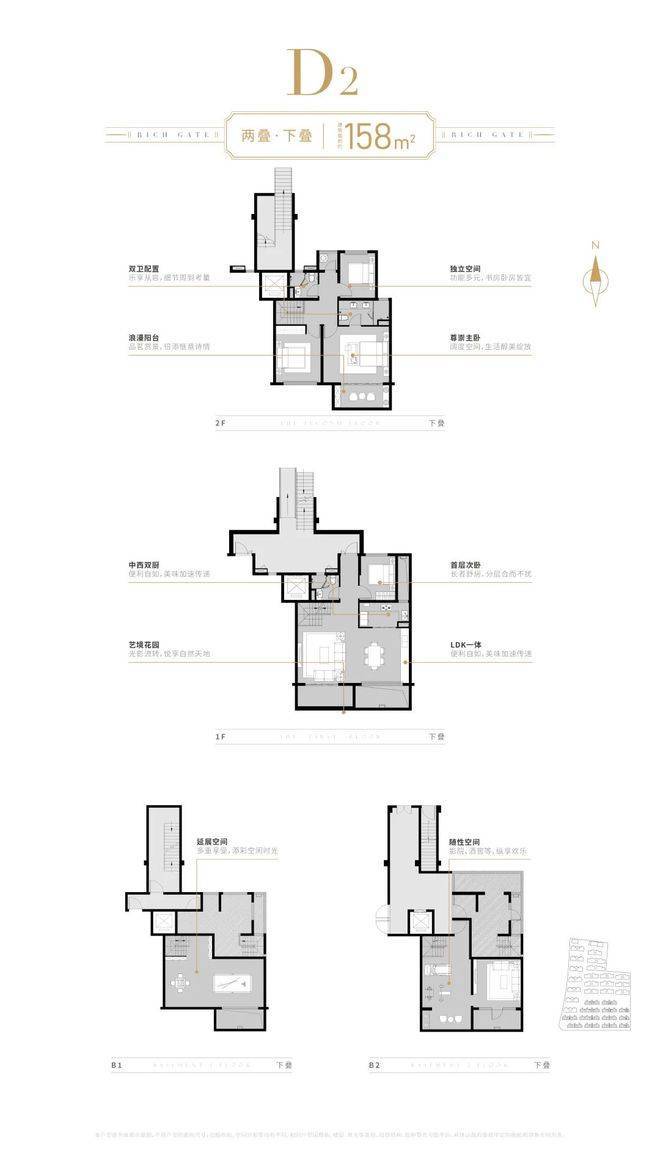 上下叠均带有双层地下室,下叠带南花园,北面入户花园;上叠北花园带露台、闷顶!