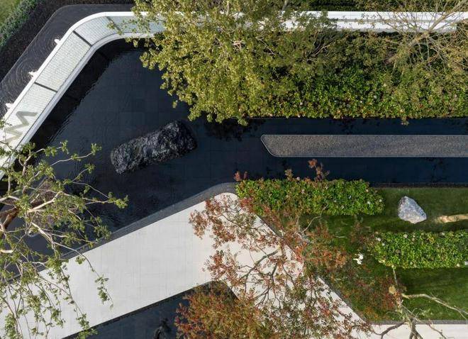 蜿蜒曲折的园路让人仿佛穿越在山水画卷中,水景如镜,豁然开朗,如同长卷展开,映水卷营造了一个精致优雅的景色,天光云影、花草树木、光屏与建筑的倒影在水面上交相辉映,令人陶醉其中。人们漫步其中,感受自然与建筑的完美融合。水面的映衬赋予空间更深厚的层次感,仿佛将人们带入一个神奇的世界。空间感由此延伸。工作之余,水畔驻留,心旷神怡。