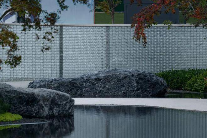 转过光屏,外部的嘈杂与之隔绝开,潺潺流水先闻其声,近景水面粼粼,远景山石静卧,动静结合,山水之间,更显纯粹。场景的更迭伴随情绪的转换,访客心情由浮躁归为平静。水景之中点缀几处跳泉,荡漾微波,延绵扩散,为静谧的景致中增添了一抹动态之感。人们在水泉旁停留,潺潺流水的声音洗涤着心灵,灵感如泉水般涌现。