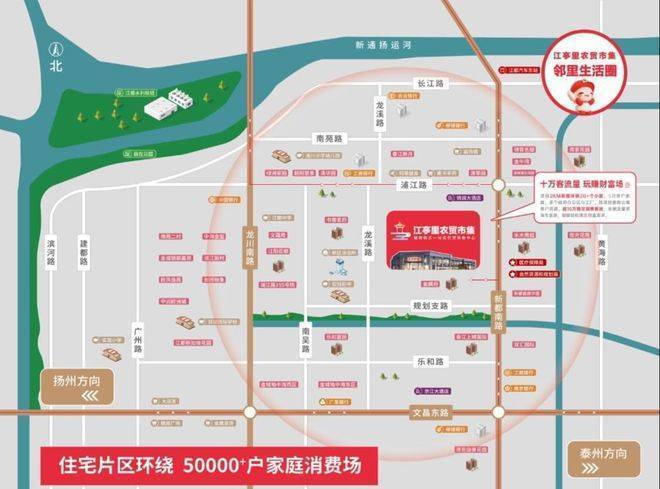 江都首家智慧农贸市集,纯一楼菜场,精装修交付 ,回本周期短,1公里范围内有多家学校,人流量大。对面就是实验初中9000个学生,江都中学和江都国际两公里范围,离江都金鹰两公里,到江都万达三公里,周边五十个成熟小区,二十万的消费人群
