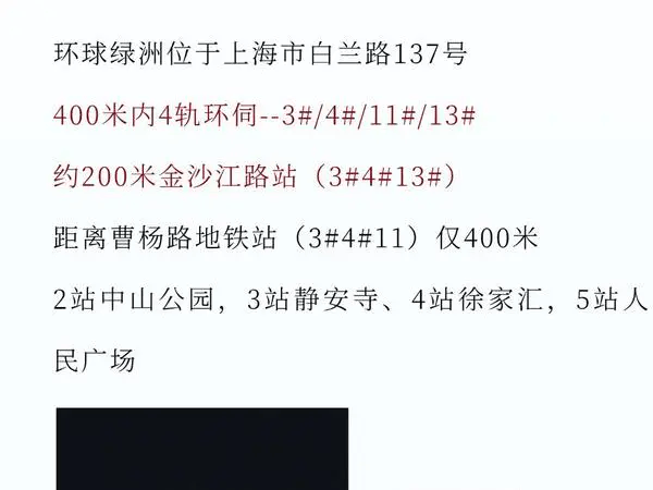 交通:环球绿洲位于上海市白玉兰路137号,400米内4轨环伺--3#4#11#13#距离曹杨路地铁站400米,2站中山公园,3站静安寺,4站徐家汇,5站人民广场。