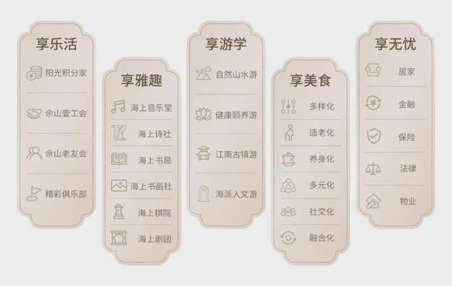 “五享服务体系” 涵盖57项基础服务和89项增值服务,融入上海地域文化情怀,包括 “享乐活”“享雅趣”“享游学”“享美食”“享无忧” ,为长者带来全新臻享生活体验,提供有温度、有品质的康养服务。