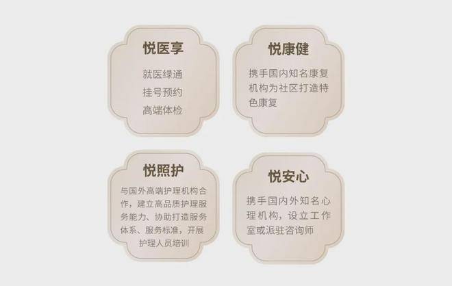 “四悦”医护服务保障 凭借高品质医护资源和176项健康服务,从“身、心、灵”三个维度为长者提供全方位健康管理方案。围绕 “悦医享”“悦康健”“悦照护”“悦安心” 四个维度进行专业评估,提供定制专享服务,助力长者续写精彩生命华章。
