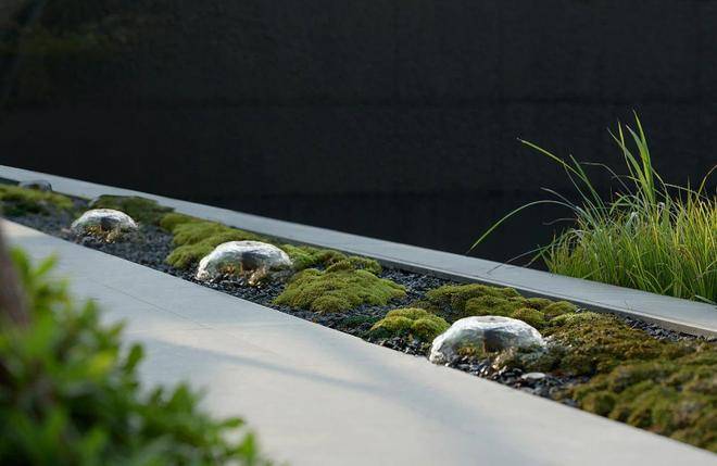 洽谈区掩映在绣球花径与娜塔栎的树影婆娑之中,水系环绕,背靠浓密的植物背景,打造静谧的户外会客空间,将人们带入一个诗意与雅致并存的境地。悬浮于水面的苔藓案台,从远处的水景一直延伸到会客区中央,与潺潺涌泉、天然置石、雅致植物相结合,如精致盆景一般的微观山水,展现山水美学的精髓和品味。一抹浮苔,将会客区的视线引向远处的景观,营造疏朗惬意相互渗透的空间。