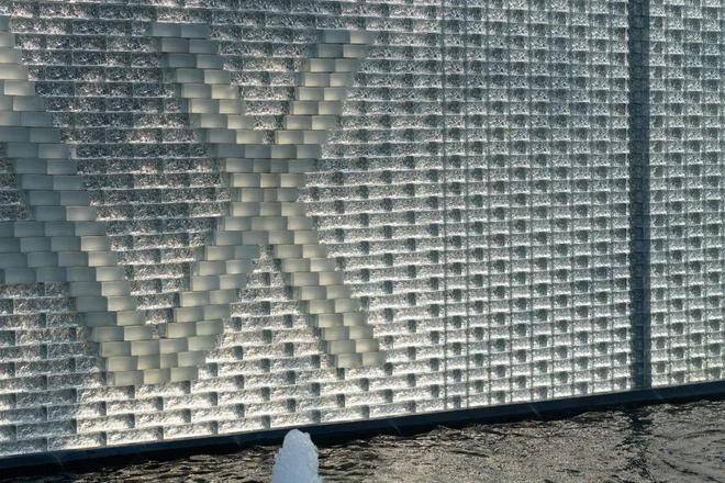 转过光屏,外部的嘈杂与之隔绝开,潺潺流水先闻其声,近景水面粼粼,远景山石静卧,动静结合,山水之间,更显纯粹。场景的更迭伴随情绪的转换,访客心情由浮躁归为平静。水景之中点缀几处跳泉,荡漾微波,延绵扩散,为静谧的景致中增添了一抹动态之感。人们在水泉旁停留,潺潺流水的声音洗涤着心灵,灵感如泉水般涌现。
