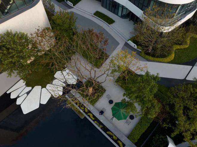 洽谈区掩映在绣球花径与娜塔栎的树影婆娑之中,水系环绕,背靠浓密的植物背景,打造静谧的户外会客空间,将人们带入一个诗意与雅致并存的境地。悬浮于水面的苔藓案台,从远处的水景一直延伸到会客区中央,与潺潺涌泉、天然置石、雅致植物相结合,如精致盆景一般的微观山水,展现山水美学的精髓和品味。一抹浮苔,将会客区的视线引向远处的景观,营造疏朗惬意相互渗透的空间。