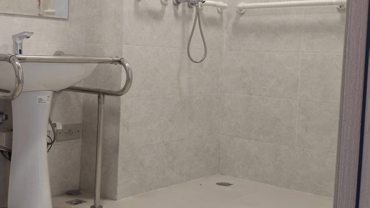 南沙区残疾人照顾中心总投资超1亿元,由一栋9层托养主楼与一栋5层后勤服务楼组成,并配建地下停车库。建筑严格遵循《无障碍设计规范》,从入口坡道到室内扶手,从防滑地砖到智能呼叫系统,每一处细节均体现对特殊群体的深度关怀。