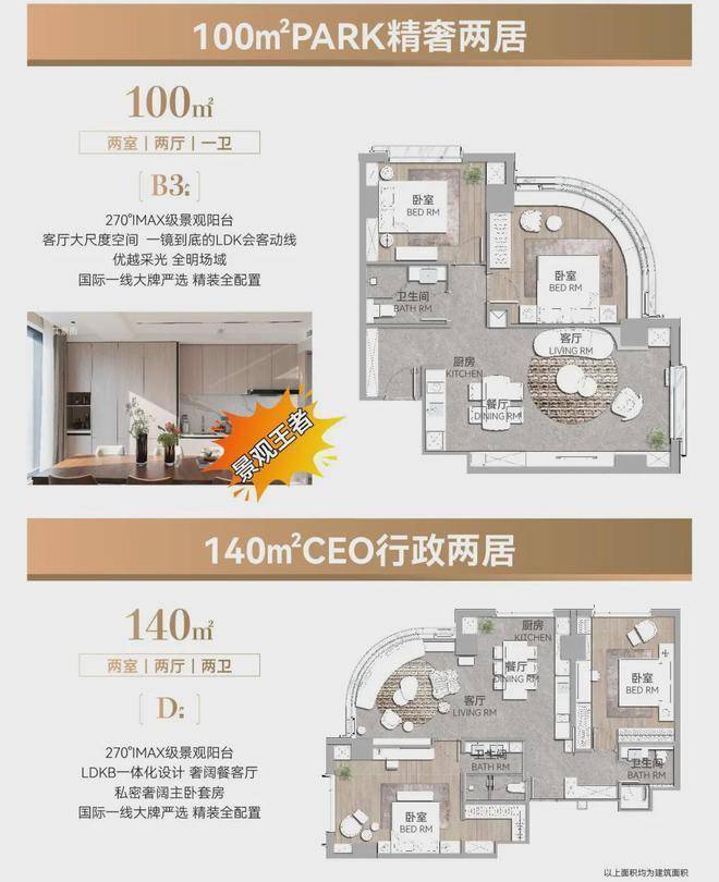 已经开放的100㎡ (建面) 样板间,大面积落地玻璃窗采用弧形设计,带来了优越的采光和视野。