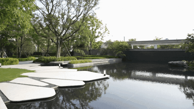 洽谈区掩映在绣球花径与娜塔栎的树影婆娑之中,水系环绕,背靠浓密的植物背景,打造静谧的户外会客空间,将人们带入一个诗意与雅致并存的境地。悬浮于水面的苔藓案台,从远处的水景一直延伸到会客区中央,与潺潺涌泉、天然置石、雅致植物相结合,如精致盆景一般的微观山水,展现山水美学的精髓和品味。一抹浮苔,将会客区的视线引向远处的景观,营造疏朗惬意相互渗透的空间。