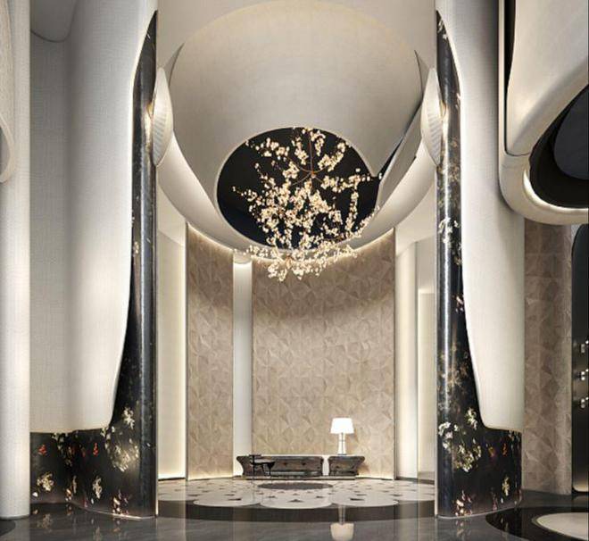 绿地外滩中心的一楼 约10米挑高的奢华酒店大堂,以米白与暗金为主色调,延续外滩百年纹理,印记着魔都的魅力之光。