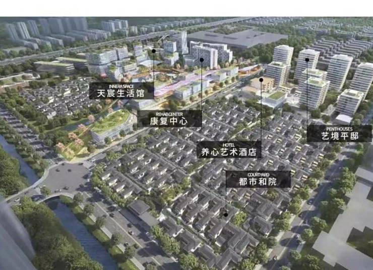 『天宸国际社区』北临银都路,南至梅州路,东起S4沪金高速,西至都莲路,总占地约400亩,是涵盖精品酒店、康复医院、九年一贯制学校、艺术商业街区和健康多元化产业社区。