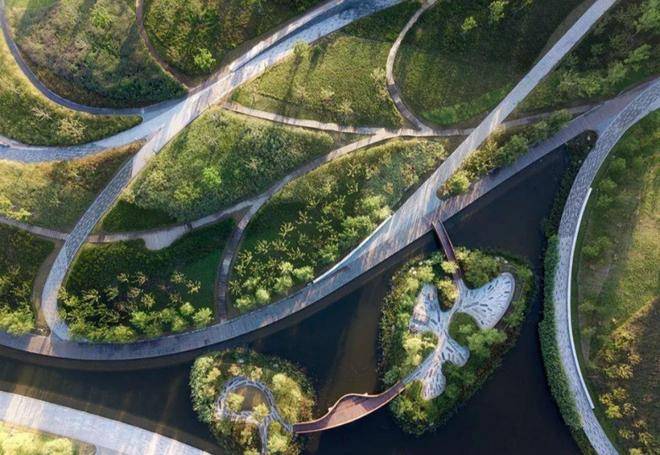 项目外部—— 400米处即是占地100公倾的桃浦中央绿地,绿化率达到70%,步道设计行云流水、颇具美感,一年四季景色各异,是休闲疗愈的天然氧吧。