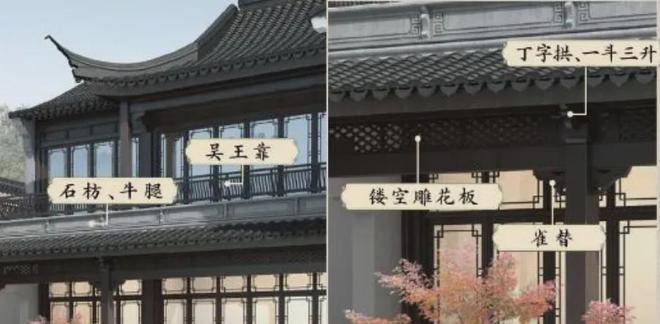 上海桃花源金瑞园由繁入简,分解提炼出属于当下的 中式审美,在明清风格中优化融入宋代特点 ,如出檐宽广, 并增设斗拱、镂空雕花、甘蔗脊竖、阑额等元素。