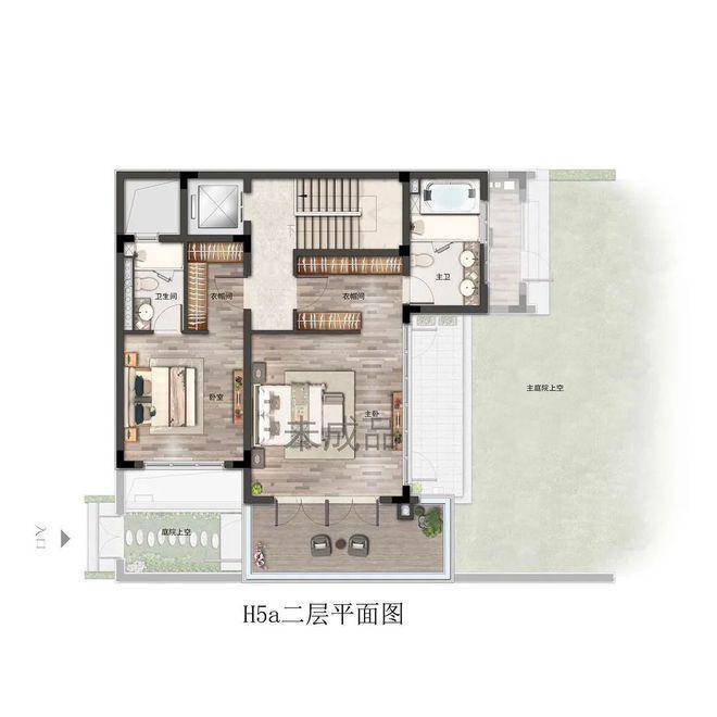 二层双卧朝南, 主卧尺度奢阔,起居室→衣帽间→卫浴间层层递进。较一期 新增的地上楼层露台设计, 更延伸了室内的使用空间。