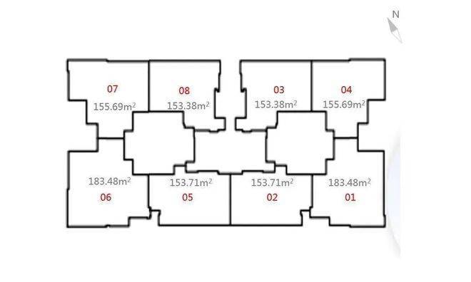 1.TODTOWN天荟 | 悦麟分为两个单元,每个单元三梯四户,主力户型为建面约153~185㎡行政公馆,层高约3.3米,得房率高达约77%,这点非常难得!