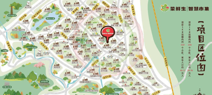 项目3公里常驻人口达 46 万人口,不光有固定的住宅消费人群,还有2000多家的饭店餐厅,这部分的餐饮店,对农贸市场的需求是具大的。另外我们项目周边学校、医院和企业众多,他们食堂的采购也是非常巨大的一个数字量。