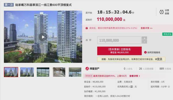 2022年10月,在阿里拍卖网站上,陆家嘴滨江挂牌了2套“高价房”,一套来自九庐,起拍价3021万元,折合约12.17万/㎡。另外一套位于万科翡翠滨江,起拍价1.1亿元,顶楼复式+地下车位,折合约17.87万/㎡,这其中还不包括各种税费。