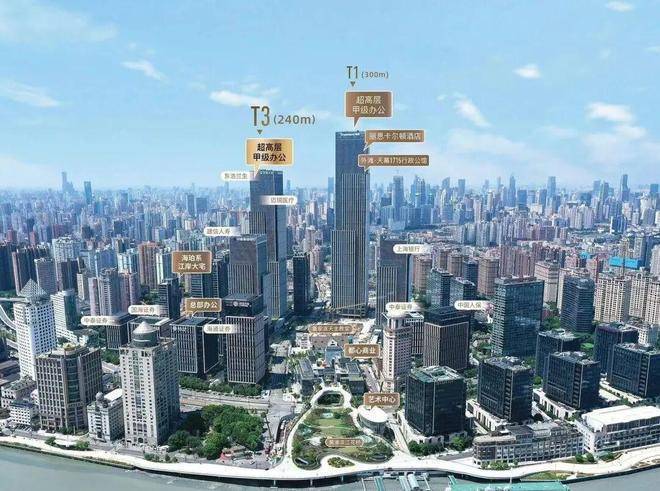 T1 -300米超高层塔楼上部46-62层为五星级酒店(丽思卡尔顿)、38,40-45层行政公馆,中部7-37层为甲级办公,底部为商业及大堂。