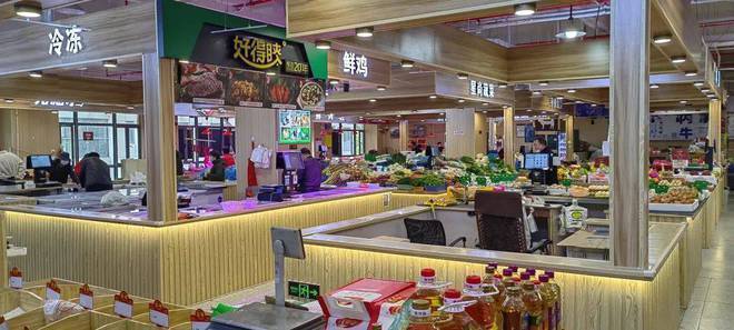 菜市场是社区居民日常生活中不可或缺的一环,标准化菜场智慧化升级后,曾经最具“烟火气”的地方也在紧跟城市数字化转型的步伐。与传统菜场脏乱差环境不同的是,改造后的菜场整洁明亮,商铺分布规整有序,一铺一位品类丰富齐全,涵盖了河鲜海鲜、牛羊猪肉、半成品、禽蛋类、果蔬菜、粮油杂粮等,而且菜场还加装了中央空调,整体环境凉爽舒适。通过智慧化改造后,菜场门口的智慧大屏每日会显示菜价与热销店铺等信息