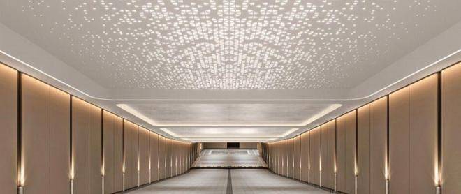 建筑外立面采用高端氟碳喷涂铝板、意大利进口天然奢石与德国旭格系统门窗,搭配复刻宋式建筑精髓的飞檐斗拱、格栅花窗,线条简约大气却暗藏东方韵律,历经岁月洗礼仍能保持质感如新;屋顶采用深灰色陶瓦,与佘山山林的自然色调相融,从空中俯瞰宛如生长于山林间的璞玉。