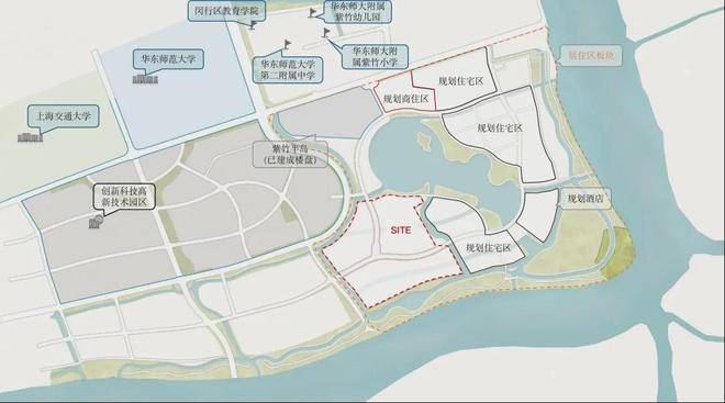 项目西侧是紫竹高新技术园区、北面是交大和华师大校园,以及紫竹基础教育园区,包含幼儿园至高中全龄段教育配套。