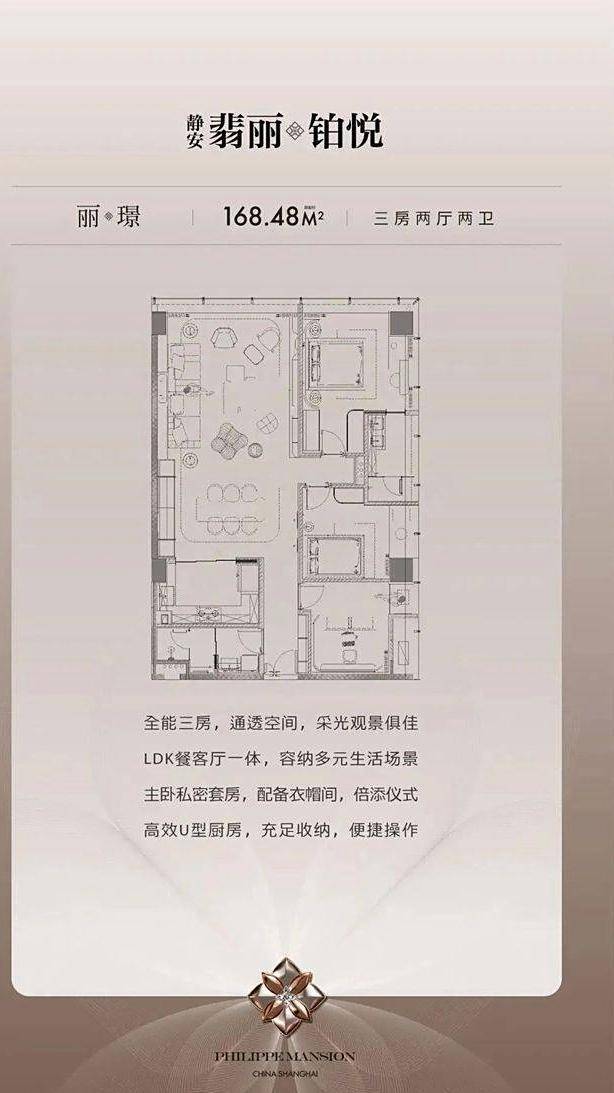 丽璟户型:约168㎡|3房2厅2卫(U型厨房)。