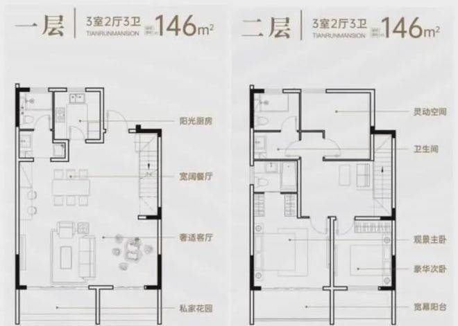 主力户型:建面约146-147㎡叠墅(分上叠/下叠),上叠配私家电梯+顶层露台,下叠赠送150㎡独立花园+25㎡露台