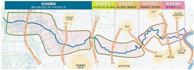 五大功能子区段中,中间的三个区段都出现了普陀的身影,分别是时尚创意段、校园风情段、新绿宜居段。