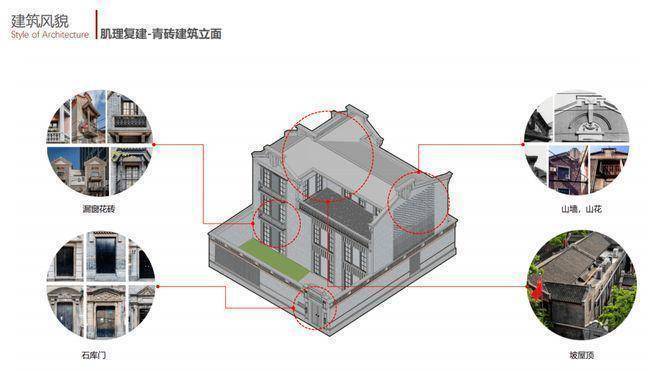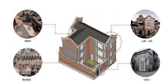立面设计上,项目还原了 上海海派风格 ,同时使用老砖、老瓦、老石箍等保留构件,更加贴近场地历史,延续传统历史建筑风貌。