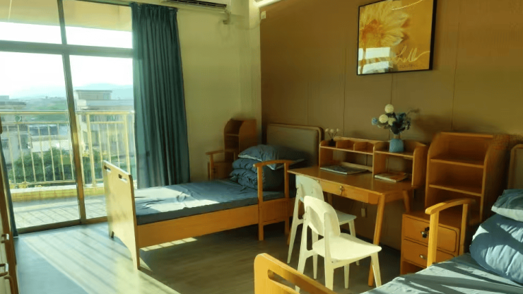 房间全适老化配置:独立卫浴、防滑地胶、双层扶手、智能紧急呼叫、医用护理床、冷暖空调,公共区域无障碍通行,护理站 24 小时值守,全方位保障安全。