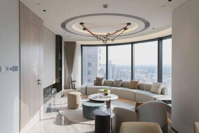 已经开放的100㎡ (建面) 样板间,大面积落地玻璃窗采用弧形设计,带来了优越的采光和视野。