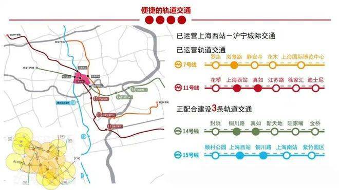 已开通: 7号线、11号线、14号线、15号线。四线交汇,可快速直达静安寺、徐家汇、陆家嘴、浦东前滩、虹桥枢纽等几乎所有核心商圈与交通枢纽。