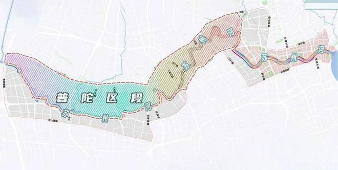 五大功能子区段中,中间的三个区段都出现了普陀的身影,分别是时尚创意段、校园风情段、新绿宜居段。