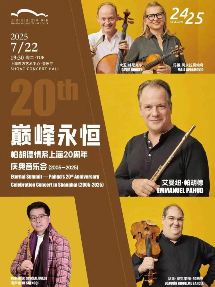 这个7月,东艺的星光音符汇聚成璀璨星河,继7月7日十二把大钢琴拉开东艺廿载夏日序幕后, “当代长笛之王”艾曼纽·帕胡德将于 7月22日携手柏林爱乐乐团的小提琴家玛雅·阿夫拉莫维奇、中提琴家华金·里克尔梅·加西亚、大提琴家大卫·林尼克尔,并特邀中国长笛领军人何声奇加盟,续写音乐的巅峰永恒。