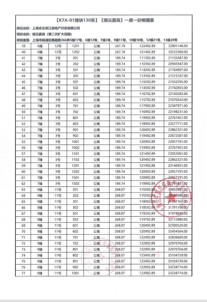 一房一价表如下