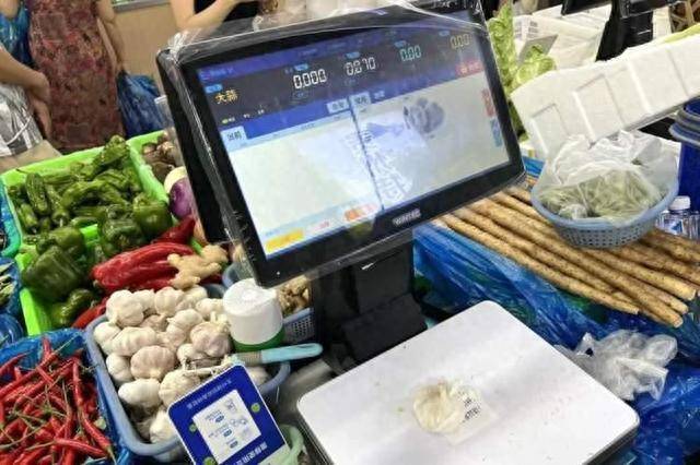 市场里使用的电子秤是AI智能秤,它是经过上海市计量器具强检中心强检过的,每个秤都贴有标签,摊主是无法打开的,不能做任何手脚。”拿一放,就完成了交易。