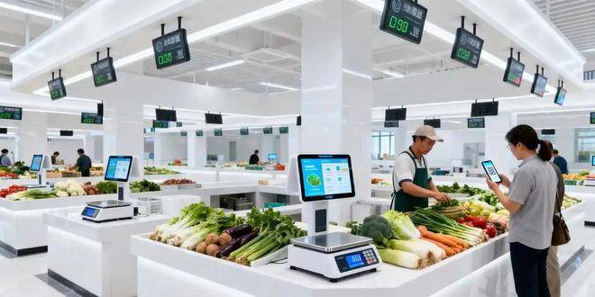 相较于传统菜场,华商菜市智慧农贸菜场从根源上重构了 “买菜” 与 “卖菜” 的体验。走进这里,没有刺鼻的异味,取而代之的是干净整洁的分区规划 —— 鲜肉区、蔬果区、水产区、干货区等一目了然,统一的智能溯源电子秤整齐排列,消费者扫码就能查看食材的产地、检测报告、流通轨迹,“吃得放心” 不再是一句口号。同时,菜场还配备了智能支付系统、线上预订配送平台、客流分析系统,不仅让消费者享受 “线下挑选 + 线上下单” 的便捷,更能帮助摊主精准把握消费需求,减少库存浪费,提升经营效率。