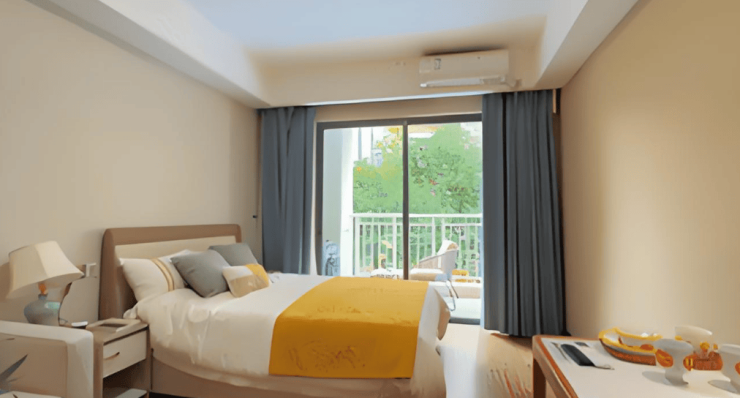 越秀悦麓居总建筑面积达6.8万平方米,涵盖1栋护理院、1栋养护院及3栋活力公寓,规划床位802张,可容纳千名长者居住。社区内房型多样,从40平方米的雅致单间到80平方米的尊享套房应有尽有,所有房间均朝南并配备景观阳台,确保全天候自然采光。房间内采用适老化设计,包括圆角家具、3°防滑地面、毫米波雷达跌倒监测系统、床头24小时紧急呼叫按钮及无障碍通道,全方位保障长者的居住安全。