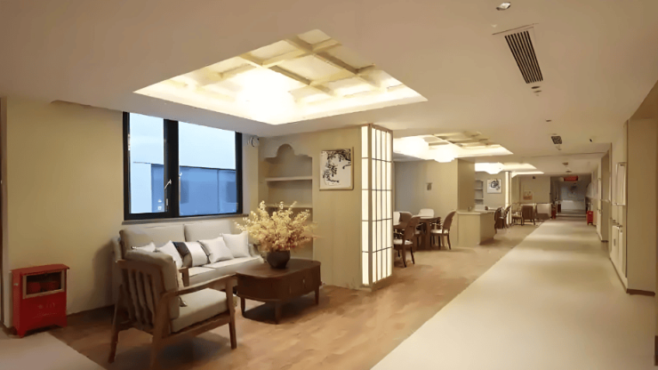 适老化设计:全屋采用圆角家具防撞、防滑地胶、24小时呼叫系统,59间居室涵盖单人间至四人间,屋顶花园设环形步道与园艺区,满足长者休闲需求。