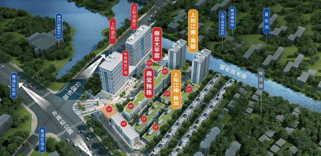The total construction area is about 112000 square meters, including high-end business hotels, 15 story commercial reception rooms, commercial flat floors, row houses, and residential products. Residential products are divided into high-rise and stacked.