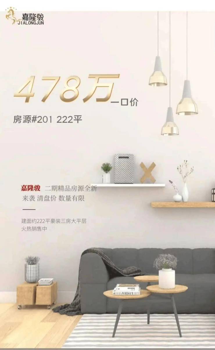 精装大平层:建面约220㎡,单价约2.1万元/㎡起,总价约478万元起;